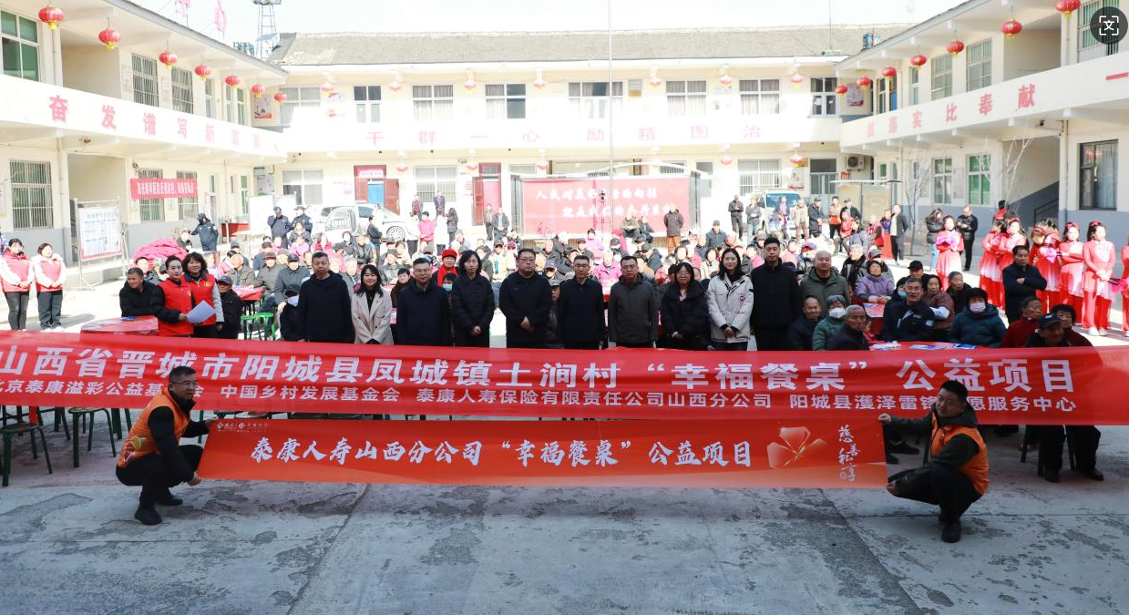 来源: 泰康人寿春日渐暖,温情相伴。2026年2月12日,泰康溢彩“幸福餐桌”公益项目在山西省晋城市阳城县凤城镇土涧村温暖启动。本次活动由北京泰康溢彩公益基金会、中国乡村发展基金会联合支持,泰康人寿山西分公司、阳城县凤城镇土涧村村委会协办,阳城县濩泽雷锋志愿服务中心承办,以爱心助老传递新春温暖,为泰康三十周年献上一份温暖的公益礼赞。