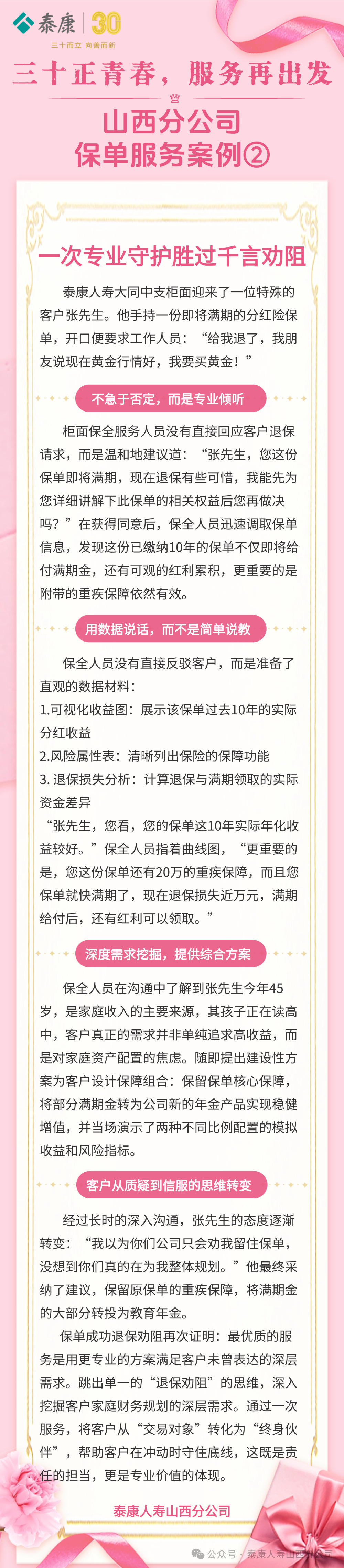 三十正青春 服务再出发 | 泰康人寿大同中支保单服务案例:一次专业守护胜过千言劝阻